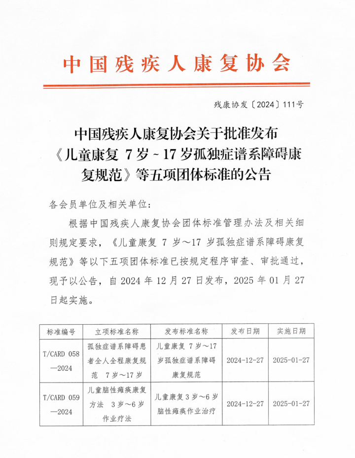 近日,中國(guó)殘疾人康復(fù)協(xié)會(huì)發(fā)布關(guān)于批準(zhǔn)發(fā)布《兒童康復(fù)7歲~17歲孤獨(dú)癥譜系障礙康復(fù)規(guī)范》等五項(xiàng)團(tuán)體標(biāo)準(zhǔn)的公告。公告稱《兒童康復(fù)7歲~17歲孤獨(dú)癥譜系障礙康復(fù)規(guī)范》等五項(xiàng)團(tuán)體標(biāo)準(zhǔn)已按規(guī)定程序?qū)彶?、審批通過(guò),自2024年12月27日發(fā)布,2025年1月27日起實(shí)施。