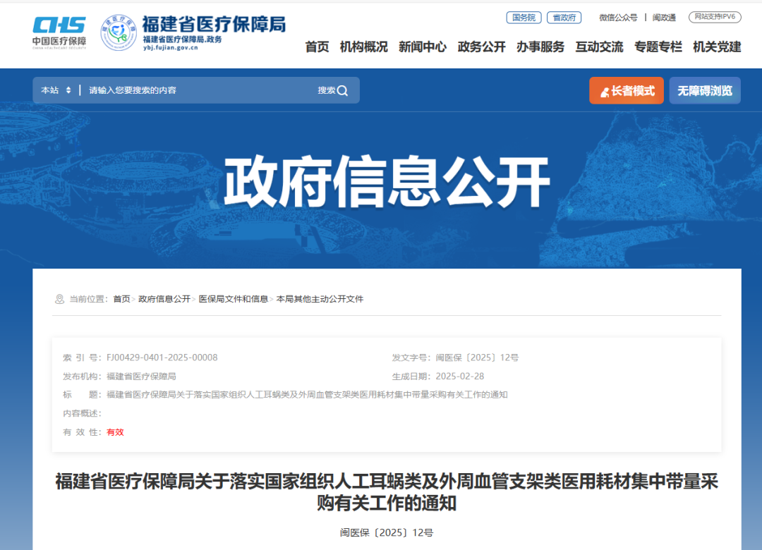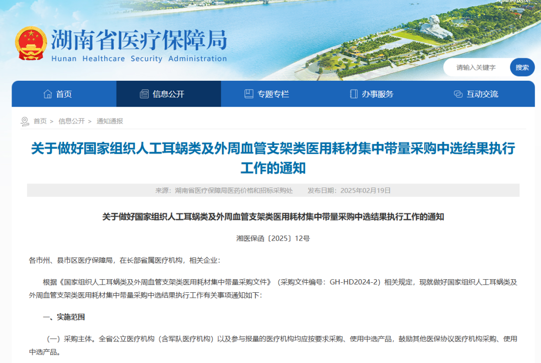 2月28日,福建醫(yī)保局發(fā)布《關(guān)于落實(shí)國家組織人工耳蝸類及外周血管支架類醫(yī)用耗材集中帶量采購有關(guān)工作的通知》,其中指出,人工耳蝸類中選結(jié)果于2025年3月7日在福建省醫(yī)療保障信息平臺藥品和醫(yī)用耗材招標(biāo)和采購交易子系統(tǒng)掛網(wǎng),3月11日起正式執(zhí)行;外周血管支架類中選結(jié)果于5月12日在招采子系統(tǒng)掛網(wǎng),5月14日起正式執(zhí)行。