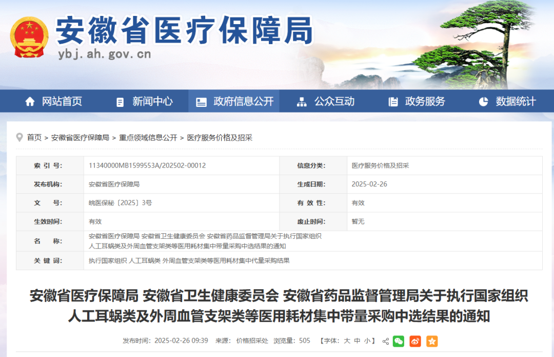 3月3日,陜西省醫(yī)療保障局發(fā)布《關(guān)于做好人工耳蝸等醫(yī)用耗材集中帶量采購和使用工作的通知》,其中指出,自2025年3月31日起執(zhí)行人工耳蝸、乳房旋切針、血管組織閉合用結(jié)扎夾、導(dǎo)引導(dǎo)管和導(dǎo)引導(dǎo)絲、預(yù)充式導(dǎo)管沖洗器等醫(yī)用耗材集中帶量采購中選結(jié)果;自2025年5月1日起執(zhí)行外周血管支架集采中選結(jié)果。其中人工耳蝸、外周血管支架、乳房旋切針采購周期3年,血管組織閉合用結(jié)扎來、導(dǎo)引導(dǎo)管和導(dǎo)引導(dǎo)絲接續(xù)采購周期2年,預(yù)充式導(dǎo)管沖洗器采購周期1年。