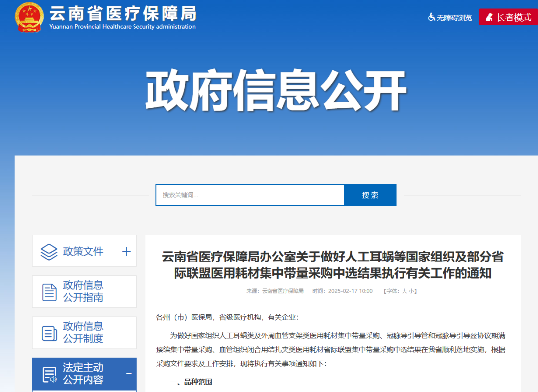 2月7日,云南省醫(yī)療保障局正式發(fā)布《云南省醫(yī)療保障局辦公室關(guān)于做好人工耳蝸等國家組織及部分省際聯(lián)盟醫(yī)用耗材集中帶量采購中選結(jié)果執(zhí)行有關(guān)工作的通知》,規(guī)定國家組織人工耳蝸類醫(yī)用耗材集中帶量采購、冠脈導(dǎo)引導(dǎo)管和冠脈導(dǎo)引導(dǎo)絲協(xié)議期滿接續(xù)集中帶量采購、血管組織閉合用結(jié)扎夾類醫(yī)用耗材省際聯(lián)盟集中帶量采購中選結(jié)果自2025年3月1日起執(zhí)行。