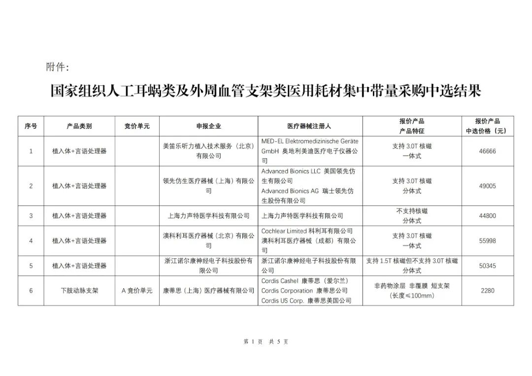 其中,人工耳蝸類集采中選結(jié)果自3月1日起執(zhí)行,外周血管支架類集采中選結(jié)果自5月1日起執(zhí)行,兩類耗材采購周期均為3年。
