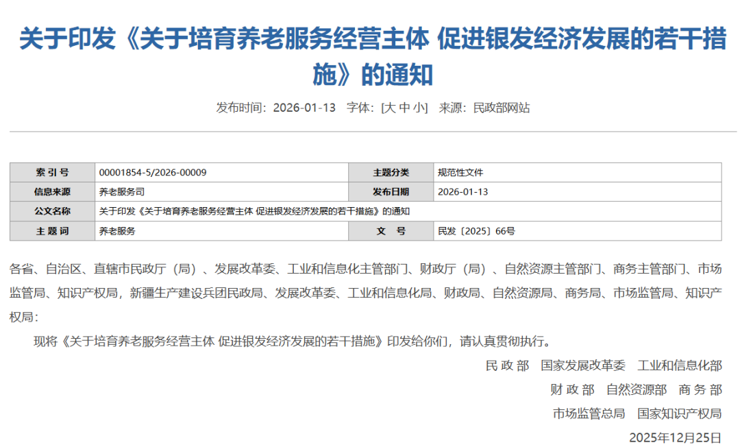 1月13日,民政部、國家發(fā)展改革委、工業(yè)和信息化部、財政部、自然資源部、商務(wù)部、市場監(jiān)管總局、國家知識產(chǎn)權(quán)局八部門聯(lián)合印發(fā)《關(guān)于培育養(yǎng)老服務(wù)經(jīng)營主體 促進(jìn)銀發(fā)經(jīng)濟(jì)發(fā)展的若干措施》。涵蓋品牌建設(shè)、供需對接、科技賦能、環(huán)境優(yōu)化和要素扶持等五個方面共14項具體舉措,旨在促進(jìn)我國養(yǎng)老服務(wù)和銀發(fā)經(jīng)濟(jì)高質(zhì)量發(fā)展。