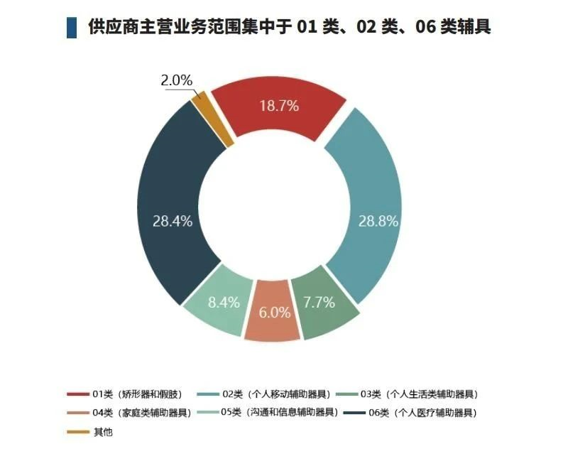 供應(yīng)商主營(yíng)業(yè)務(wù)絕大部分集中在01-06類輔具,其中02類(個(gè)人移動(dòng)輔助器具)和06類(個(gè)人醫(yī)療輔助器具)占比相對(duì)較高。結(jié)合供應(yīng)商經(jīng)營(yíng)情況可知,供應(yīng)商在02類輔具和06類輔具上的產(chǎn)銷額和產(chǎn)銷量也較高。